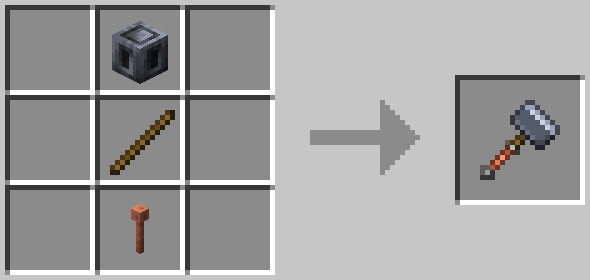 The hammer works just like a normal pickaxe, but will instead break a 3x3 area around the block broken with it. It's enchantable like a normal pickaxe, and all pickaxe compatible enchantments will work with it. It can break approximately 16200 blocks without any unbreaking enchantments.